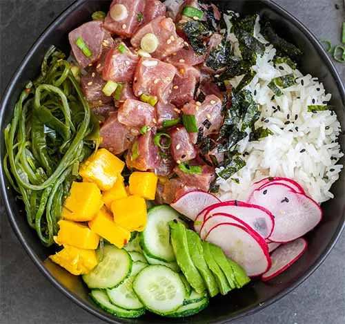 Note: Image item is not an accurate representation of product. Salmon, Mango, Pineapple, Avocado, Greenz, Chives, Sesame seeds, In-house Sauce